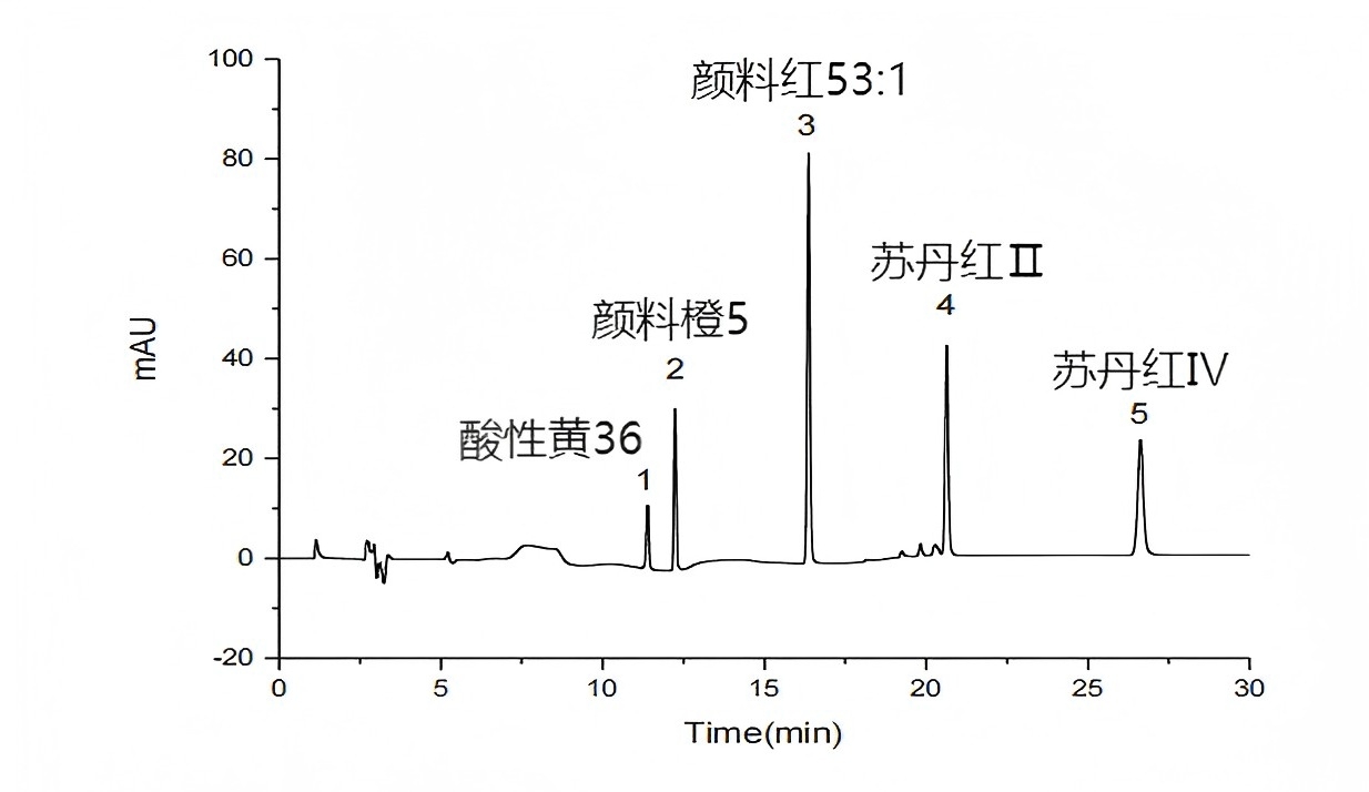 UV416nm(酸性黄 36), UV484nm(颜料橙 5、颜料红53:1、苏丹红Ⅱ), UV514nm(苏丹红Ⅳ)
