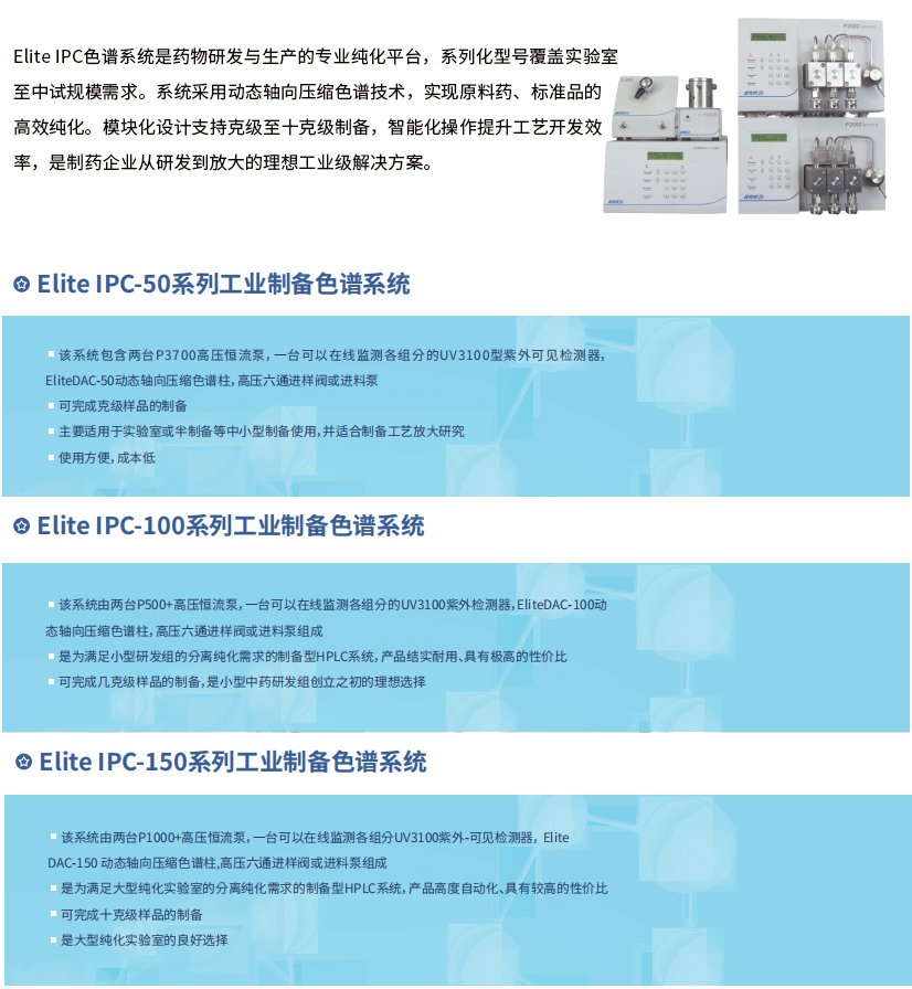 依利特科技高压半制备液相色谱系统EClassical3500/3700、3140AP,将分析和半制备一体化,为您提供完整的分析和制备化合物的自动HPLC应用方案。该系统可以方便实现分析与半制备系统之间的切换,还可完成样品进样、馏分收集等功能。依利特工业制备Elite IPC色谱系统,完成从几克级至十克级样品的制备,是小型药物研发和大型纯化实验室的良好选择。