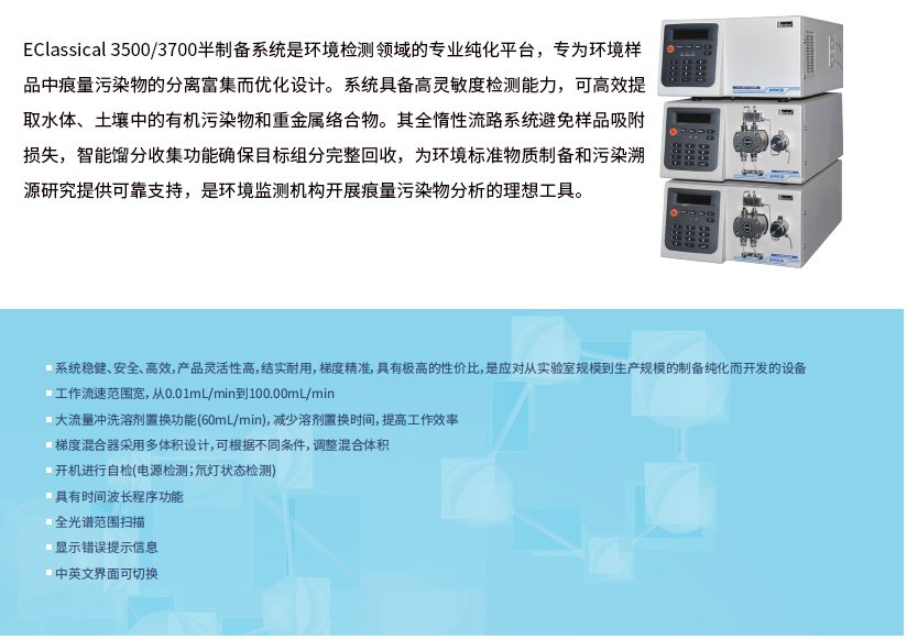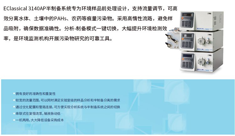 环境制备液相色谱仪通过高惰性流路和富集技术,高效分离环境样品中的痕量污染物(如PAHs、重金属),结合梯度洗脱与多模式检测,实现ppb级污染物的精准纯化与制备。