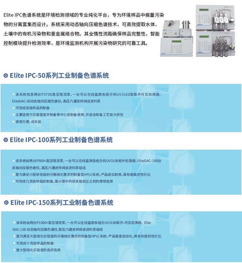 依利特科技高压半制备液相色谱系统EClassical3500/3700、3140AP,将分析和半制备一体化,为您提供完整的分析和制备化合物的自动HPLC应用方案。该系统可以方便实现分析与半制备系统之间的切换,还可完成样品进样、馏分收集等功能。依利特工业制备Elite IPC色谱系统,完成从几克级至十克级样品的制备,是小型化合物研发和大型纯化实验室的良好选择。