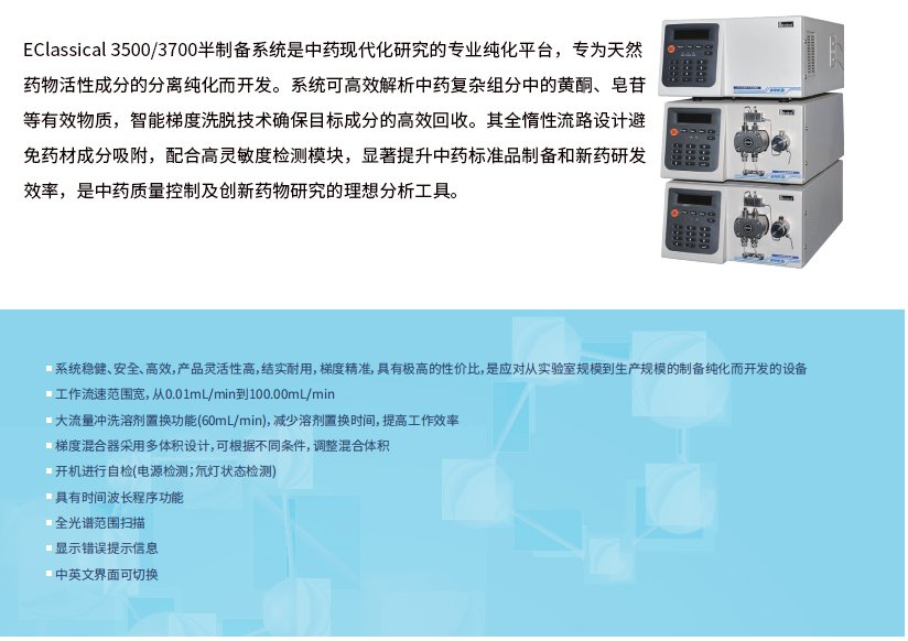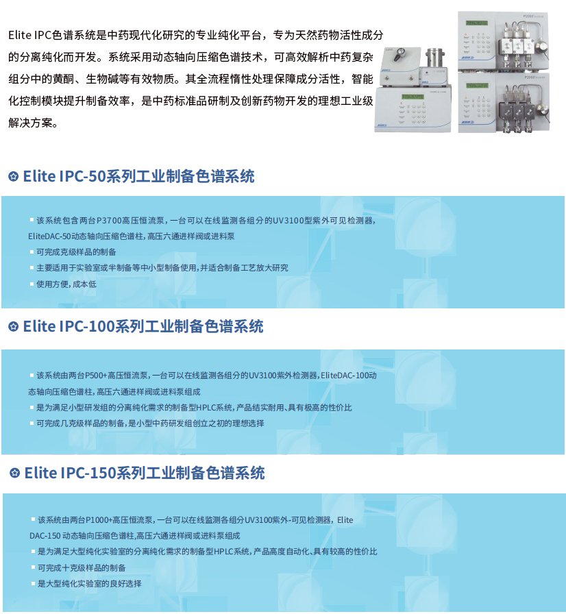 依利特科技高压半制备液相色谱系统EClassical3500/3700,将分析和半制备一体化,为您提供完整的分析和制备化合物的自动HPLC应用方案。该系统可以方便实现分析与半制备系统之间的切换,还可完成样品进样、馏分收集等功能。依利特工业制备Elite IPC色谱系统,完成从几克级至十克级样品的制备,是小型中药研发和大型纯化实验室的良好选择。