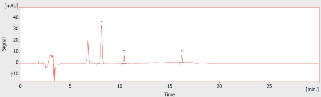 化妆品中糖皮质激素检测的色谱图1. 氢化可的松,2.地塞米松,3.氯倍他索丙酸酯