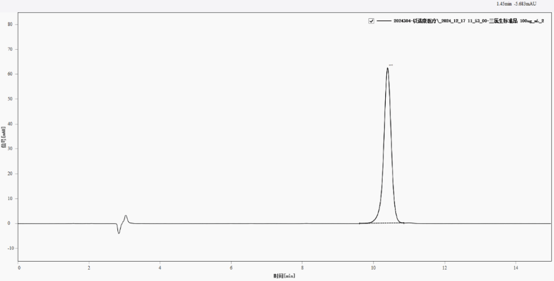 三氯生色谱图在0.1-150μg/L浓度范围内,三氯生检测具有良好的线性r>0.9999,方法灵敏度高,能充分满足检测要求。