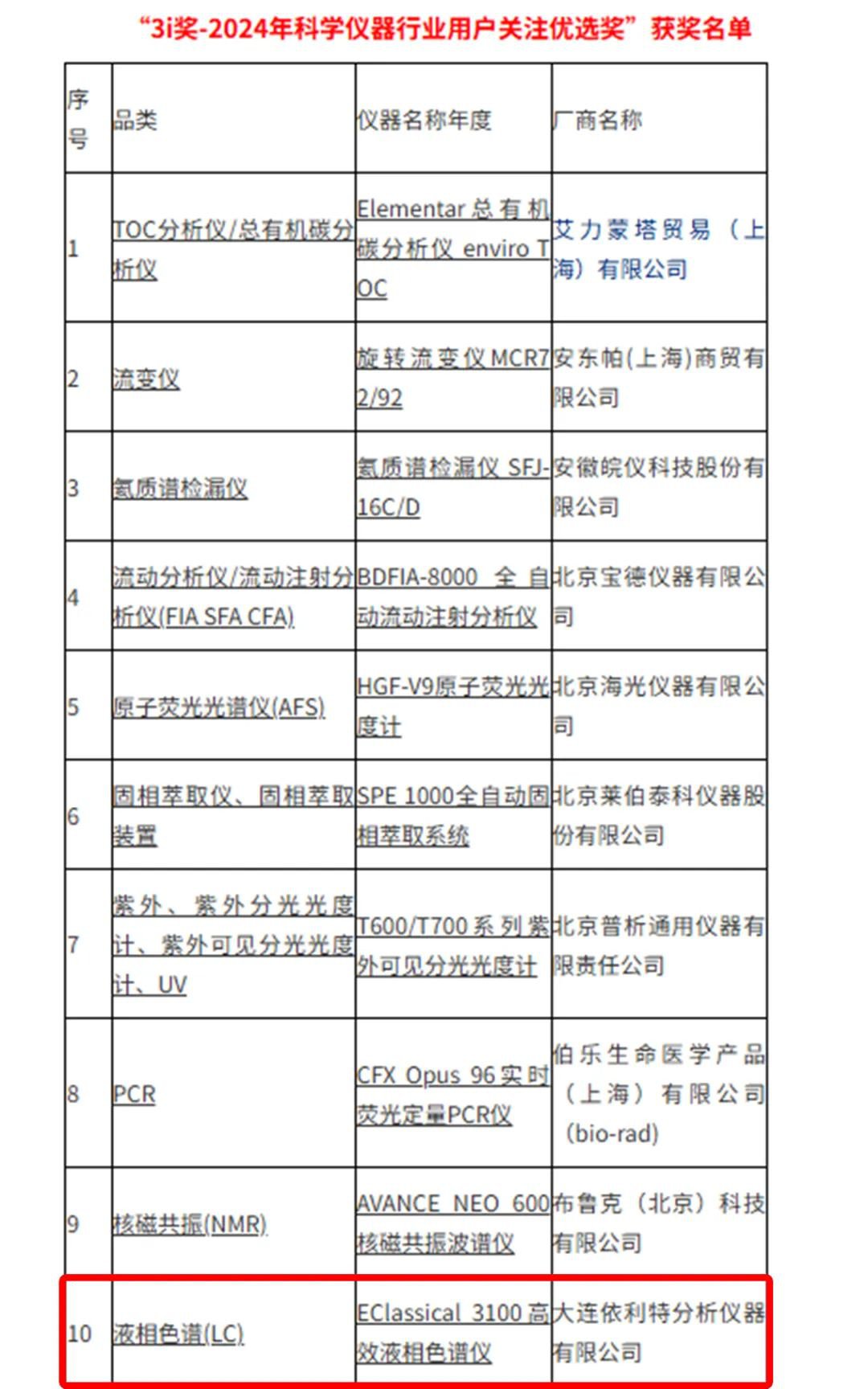 2025年5月12日,第十八届中国科学仪器发展年会(ACCSI2025)在上海盛大开幕。大会吸引超1700位科学仪器行业相关政府领导、院士专家、仪器企业CEO、检测机构负责人、投资人、媒体记者等参会,会议规模再创新高。备受瞩目的“仪器及检测3i奖颁奖典礼”于当晚隆重举行,在行业内人士的见证下,“3i奖-2024年度科学仪器行业用户关注优选奖”获奖名单揭晓,其中依利特科技EClassical 3100 高效液相色谱仪获此殊荣。