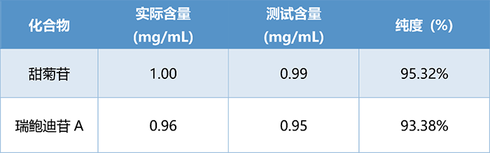 2、分离纯化效能: 选择甜菊糖苷中高价值组分——甜菊苷和瑞鲍迪苷A作为测试样品,设备自动进样10mL样品,利用其时间+阈值方法精准收集目标馏分。如下表所示,纯度均高于93%,相比文献报道的传统三步树脂法(~92.9%)更具优势。证明了设备在快速分离、稳定输出、精准收集上的性能,显著提升产品纯度和效率。
