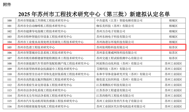 近日,苏州市科学技术局公示了2025年苏州市工程技术研究中心(第三批)新建拟认定名单,苏州依利特科技有限公司成功入选,将组建苏州市色谱工程技术研究中心。