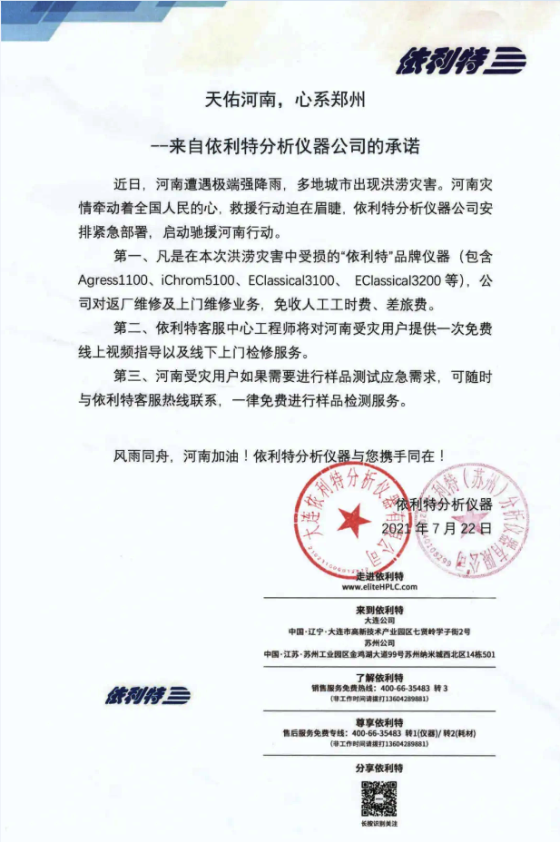 天佑河南,心系郑州——来自依利特分析仪器公司的承诺