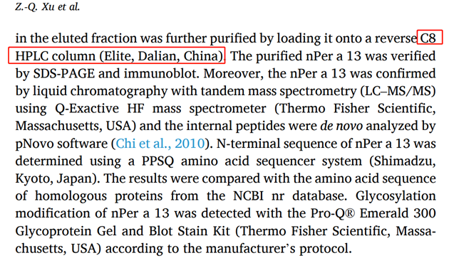 蟑螂是一类重要的室内致敏物质来源,暴露于蟑螂过敏原与免疫球蛋白E介导的过敏性疾病密切相关。Per a 13为动物源性吸入性过敏原的一个全新类型,有助于用于蟑螂过敏诊断和治疗。上面论文中Per a 13的纯化,使用的是依利特的SinoChrom C8 10μm,10.0 mm×250 mm色谱柱,纯化效果好,得到的样品纯度高。