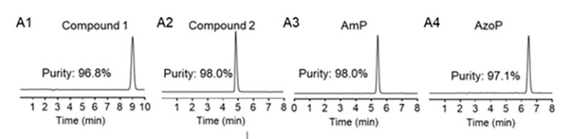 通过依利特EClassical 3100液相色谱仪对AzoP、AmP的纯度进行检测,峰形良好,并且分离度高,并且测得的结果分别为:AmP的纯度为98%,AzoP的纯度为97.1%。