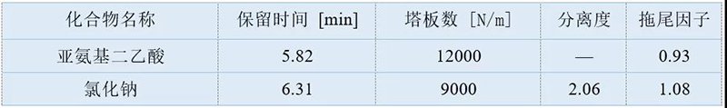 使用EClassical 3200高效液相色谱仪配Supersil SAX色谱柱分析亚氨基二乙酸及氯化钠样品溶液,柱效很高,且亚氨基二乙酸及氯化钠峰分离度很好,满足定性定量分析的需求。