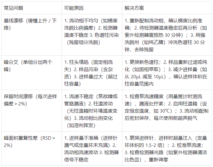基线漂移:检查流动相均匀性或检测器稳定性。