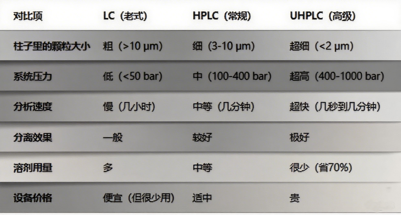 网上不少网友都在关注 LC、HPLC 和 UHPLC 的区别,依利特特意为大家梳理清楚。液相色谱(LC)、高效液相色谱(HPLC)和超高效液相色谱(UHPLC),在分离效率、分析速度、压力范围和应用场景上,有着各自鲜明的特点。下面就来看看它们的核心区别:
