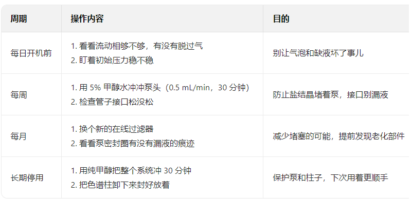 解决:赶紧停泵,用纯水慢慢冲(0.2 mL/min 的流速冲 30 分钟),再一点点换回原来的流动相;预防:记得先用水把盐彻底溶解后,再慢慢倒有机相,边倒边搅才稳妥。