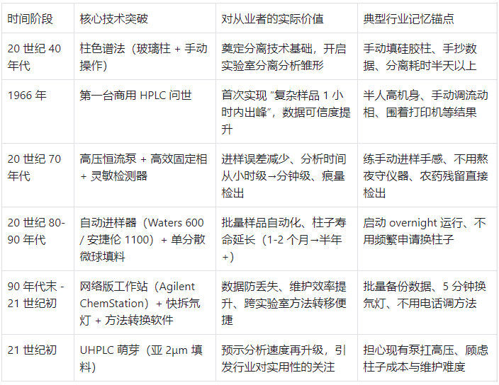 20世纪80-90年代是HPLC技术黄金发展期:自动化控制系统取代手动操作、计算机数据处理软件普及、色谱柱填料从多孔硅胶发展到单分散微球材料——这些突破让HPLC成为制药、环境、食品等领域的标准分析方法。