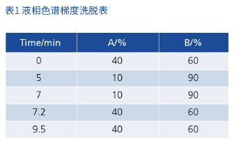 色谱柱:Quasar C18,100×2.1mm,3μm,货号:N9308812(原文提及 “Supersil ODS2 2.1×100,3μm”,以实际检测用 Quasar C18 柱为准);流动相:A 为 50% 甲醇水(含 0.5% 甲酸),B 为乙腈(含 0.5% 甲酸);柱温:40℃;流速:0.5mL/min;进样量:10μL;