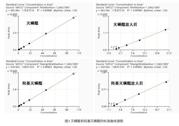 本文采用 EClassical 3200L-MS2 Vertical 9100 三重四极杆液质联用系统,建立了快速、高灵敏度且可靠的 LC-MS/MS 方法,用于测定食品中灭螨醌和羟基灭螨醌,为该类化合物提供了高通量检测手段,检出限完全满足相关标准要求。灭螨醌:y=530.50x-108.91355,R2=0.99962;羟基灭螨醌:线性方程及 R2 详见完整谱图,R2≥0.999)