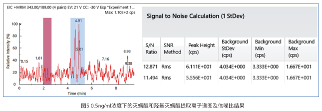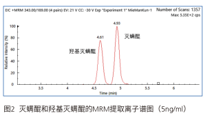 同时考察了该方法的仪器检出限情况,在0.5ng/ml的浓度下,羟基灭螨醒和灭螨醒的的信噪比分别为11和12,如下图所示,可见该方法灵敏度较高,完全满足该标准的检出要求。
