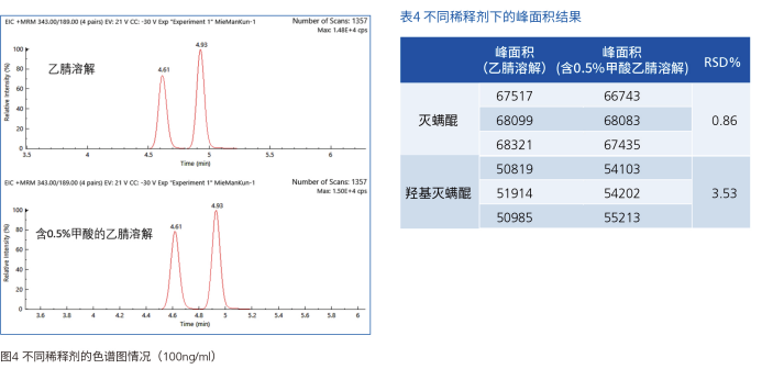对比乙腈与含 0.5% 甲酸的乙腈溶液作为稀释剂时的标准品响应(图 4、表 4),结果显示两种稀释剂对峰面积影响较小(灭螨醌 RSD=0.86%,羟基灭螨醌 RSD=3.53%),因此无需额外添加甲酸,两种稀释剂均可使用。
