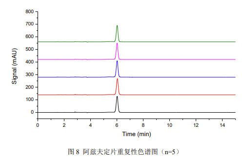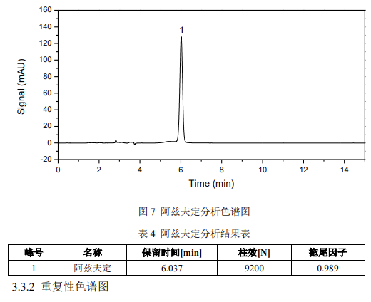 样品溶液配制:取供试品 1 药品 1 粒,称量质量为 0.1477g,取部分后研磨,称取质量为 0.0287g,用 2mL 甲醇溶解,离心,取上层清液,滤过;量取 0.5mL 上述溶液,量取乙腈 / 水 = 10:90 的溶液 0.5mL 将其稀释,得含供试品 1 浓度为 7.175mg/mL 的供试品溶液 1。按每粒药品含阿兹夫定 1mg 计算,供试品溶液 1 中的阿兹夫定含量为 0.049mg/mL。
