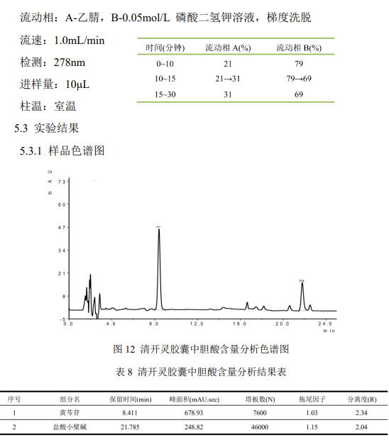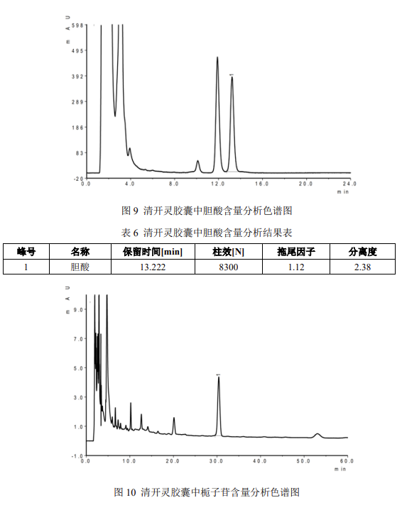 依利特使用新款的 EClassical 3200 液相色谱仪搭配 Supersil ODS2 和 SinoChrom ODS-BP 色谱柱,对清开灵胶囊中胆酸、栀子苷、黄芩苷含量进行了分析检测,结果显示目标物柱效高、峰形好,满足定性定量分析的需求。
