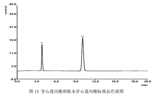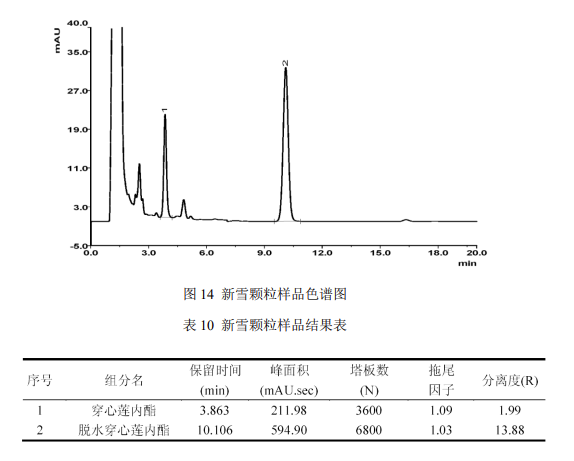 依利特使用新款的 EClassical 3200 液相色谱仪搭配 Hypersil ODS2 色谱柱,对新雪颗粒中穿心莲内酯和脱水穿心莲内酯进行了分析检测,结果显示目标物峰形良好,柱效高,可以达到基线分离,满足定性定量分析的需求。