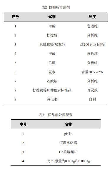 - 混合对照品溶液:分别称取柠檬黄、苋菜红、胭脂红、日落黄、诱惑红、亮蓝、赤藓红、酸性红、喹啉黄、新红各 5mg,用水溶解,配成水溶液 0.5mg/mL,将上述溶液按照 1:1 比例混合。