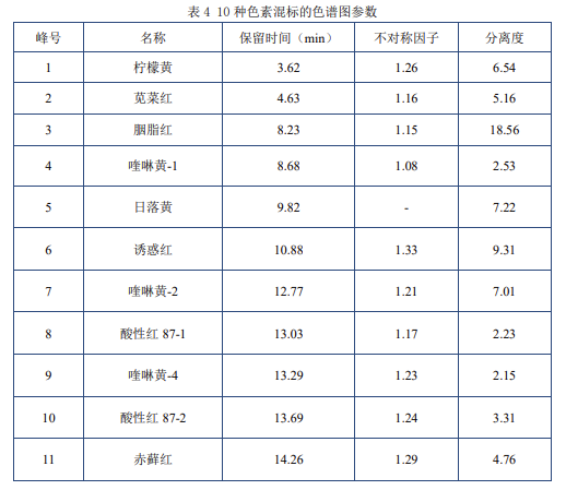 方法验证数据:10 种色素的线性范围(R2≥0.999)、精密度(RSD<2%)、加标回收率(85%-110%)完整记录;