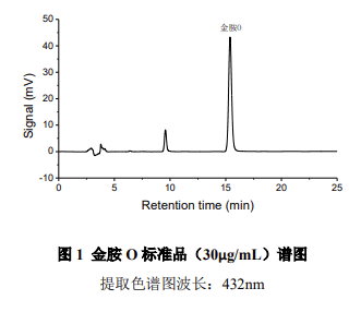 按照《中药材及中药饮片药品检验补充检验方法和检验项目批准件》食药监稽函 [2012] 200 号文件中金胺 O 检测方法,使用大连依利特分析仪器有限公司配置 DAD230 + 二极管阵列检测器的高效液相色谱仪可以分析检测中药材和中药饮片中的金胺 O,系统稳定重复,线性相关性良好,检出限低,通过光谱图比对、峰纯度计算功能,能够准确定性,避免假阳性现象,满足药监部门制定的标准要求。