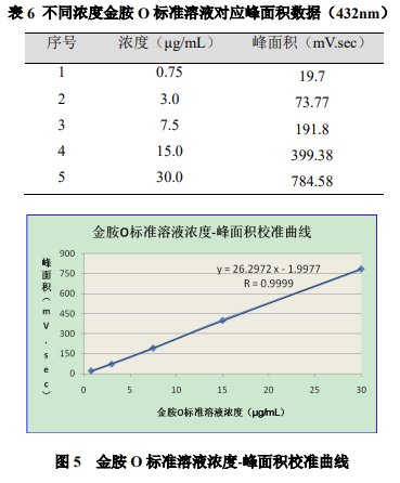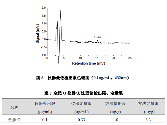 以峰高约为 3 倍信噪比对应浓度为仪器检出限,以 10 倍信噪比计算仪器定量限,噪声按 0.05mV 计算,金胺 O 仪器 / 方法理论检出限、定量限结果如下。