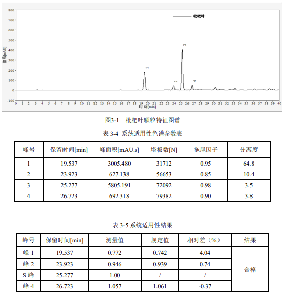 由此可见,使用依利特 EClassical 3200 高效液相色谱仪以及 Supersil AQ-C18 色谱柱,测得的枇杷叶配方颗粒的特征图谱满足药典要求。