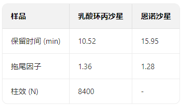 恩诺沙星保留时间 15.85min,拖尾因子 1.26,柱效(N)达 8500,分离效果与重复性优异。