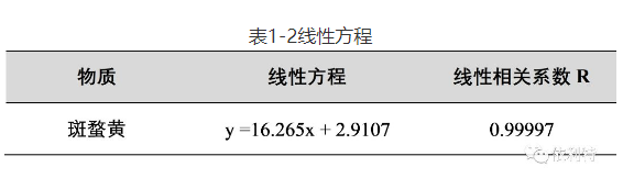 配制浓度分别为1μg/mL、2μg/mL、5μg/mL、25μg/mL、100μg/mL的标准工作液,按浓度由低至高进样,以标准品浓度为横坐标,峰面积为纵坐标,斑蝥黄的线性相关性结果如下。