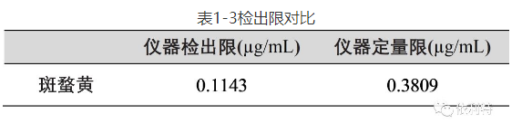 噪声按0.04mV计算,峰高为3倍信噪比对应的浓度为仪器检出限,10倍信噪比对应的浓度为仪器定量限,结果如下表所示。