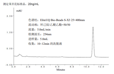 按照样品净化色谱条件,先取 20.0ng/mL 的校准品 5.0mL,按照样品净化条件进样,根据标准品出峰时间,确定样品馏分收集时间(一般收集标准品色谱峰起点时间 - 0.2min 到落点时间 + 0.2min 之间的馏分)。