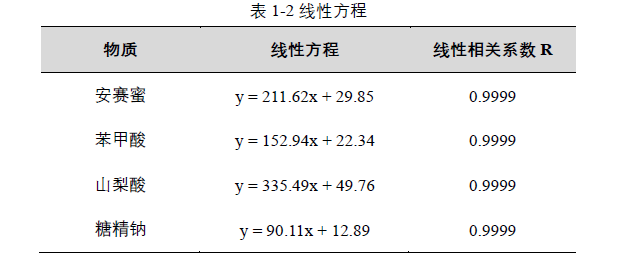配制浓度分别为5μg/mL、10μg/mL、20μg/mL、30μg/mL、40μg/mL、50μg/mL、100μg/mL的标准工作液,按浓度由低至高进样,以标准品浓度为横坐标,峰面积为纵坐标,绘制校准曲线,安赛蜜、山梨酸、糖精钠混合标准品的线性相关性结果如下。