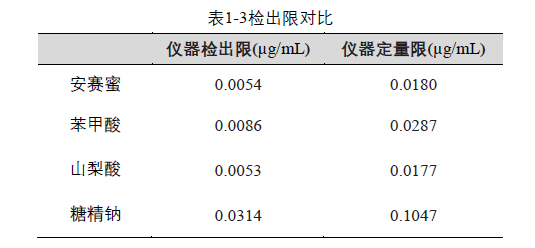 噪声按0.01mV计算,峰高为3倍信噪比对应的浓度为仪器检出限,10倍信噪比对应的浓度为仪器定量限,结果如下表所示。