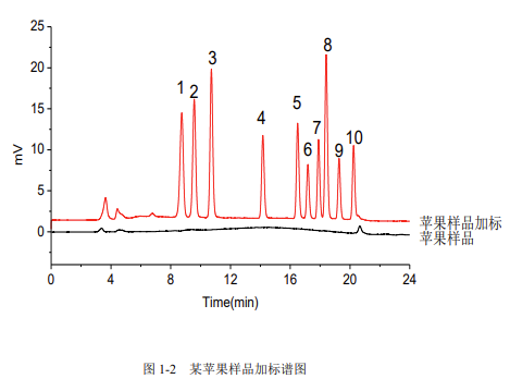 (横坐标为时间 min,纵坐标为信号 mV;含 “苹果样品”“苹果样品加标” 两条曲线,标注 10 种农药对应峰)