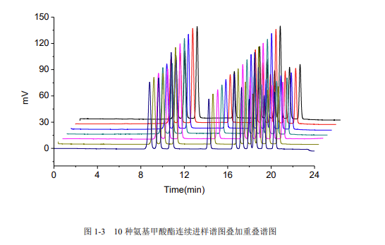 图 1-3 10 种氨基甲酸酯连续进样谱图叠加重叠谱图