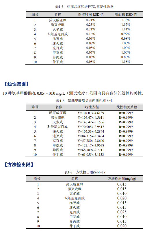 大连依利特分析仪器有限公司,结合《NY/T 761-2008 蔬菜和水果中有机磷、有机氯、拟除虫菊酯和氨基甲酸酯类农药多残留的测定》方法及相关文献中关于农残测定的要求,建立的氨基甲酸酯分析系统,提出了蔬果中氨基甲酸酯类农药残留检测的全套解决方案,并以苹果为样品进行了检测,实验结果能够达到标准中各项指标要求。