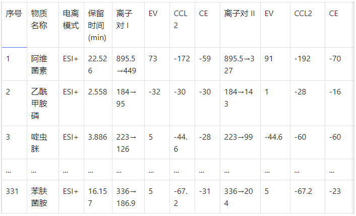 表 3 375 种农残类化合物质谱参数列表(部分示例如下,完整表格见 PDF):