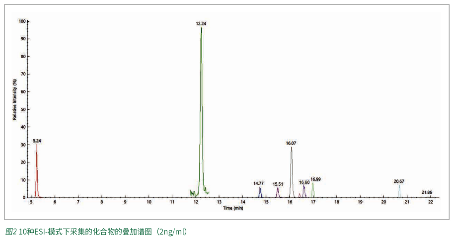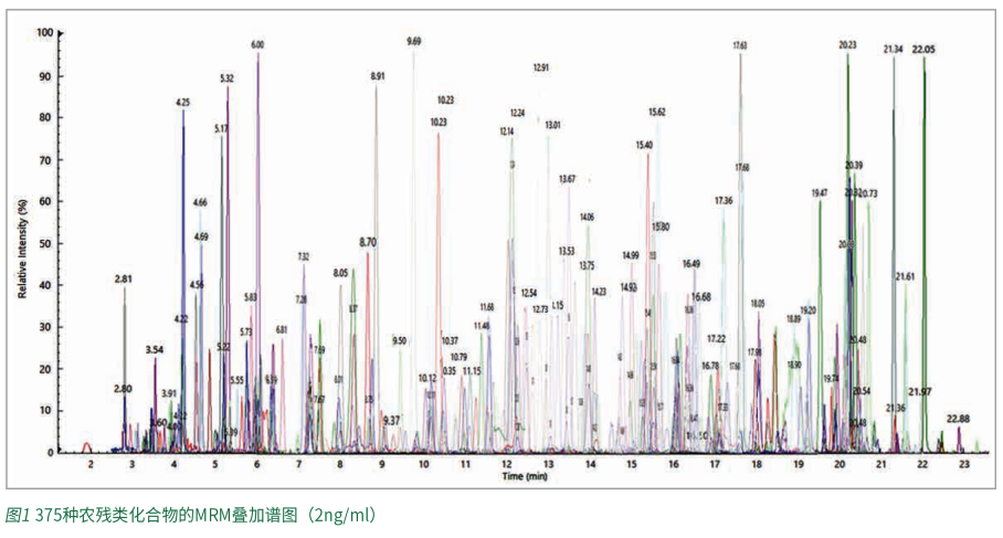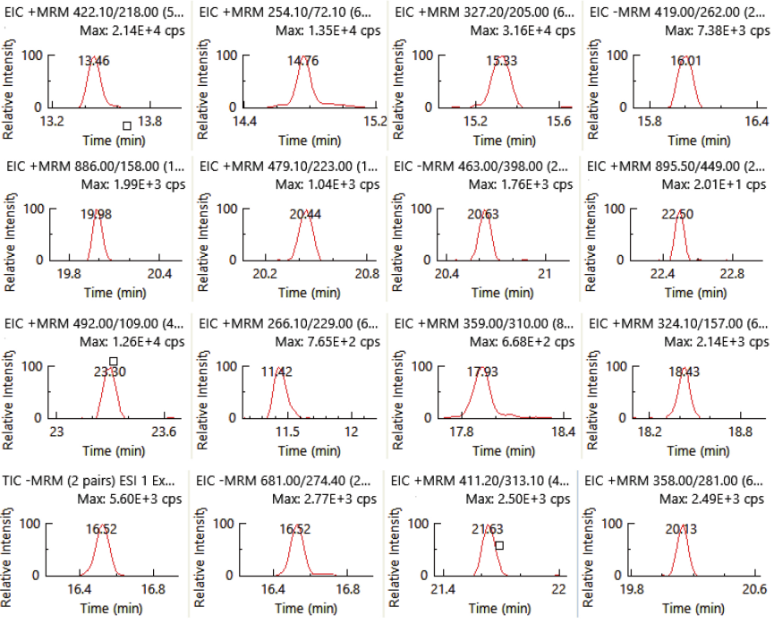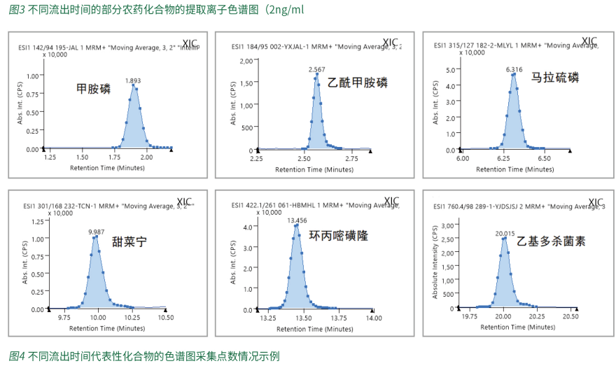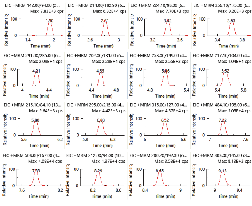 本方法采用一针进样,通过Time Managed MRM正负切换模式同时测定331种化合物及其45种代谢物,共375个化合物,其中365种化合物采用正离子模式采集,10种化合物采用负离子模式采集。图1中展示了375种化合物的提取离子叠加谱图,图2中是单独10个负离子化合物的提取离子色谱图。经过优化色谱洗脱条件,图3展示了不同保留时间的部分农药化合物的提取离子色谱图。各个化合物峰型对称,软件中TimedMRM功能目动完成375个化合物的轩留时间分配,保让每个色语峰上有足够的来集点教,以使获得准确的结果为优异的重复性,不同流出时间的代表性化合物的色谱图采集点数情况示例详见图4。