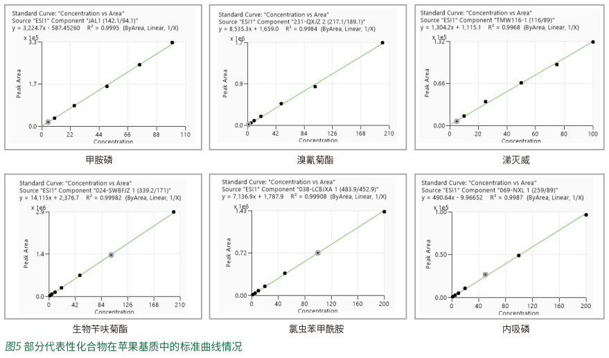 用以上3.1前处理步骤,处理阴性苹果样品作为空白基质,稀释375种化合物的混合标准溶液,制成2ng/mL-200ng/mL的系列校准标准溶液,并绘制标准曲线,采用外标法进行定量分析。图5为随机挑选的不同流出时间的化合物的标准曲线情况。其中全部化合物在线性范围内,线性关系均较好,相关系数R2均大于0.995。