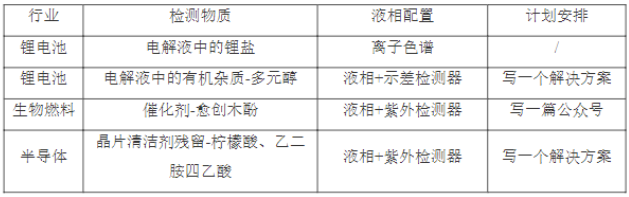 新能源产业中分析仪器使用比重较大,但主要以 ICP-AES、ICP-MS、GC-MS、拉曼光谱、红外光谱等光谱和质谱为主,液相色谱的应用较少。液相色谱主要应用在新型电池的电解液、生产过程中的有机 / 无机杂质分析等。