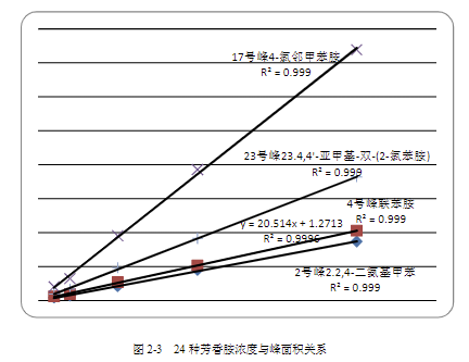 24 种混合标准溶液浓度分别为:1?2?5?10?20μg/mL,线性相关系数为 0.999。