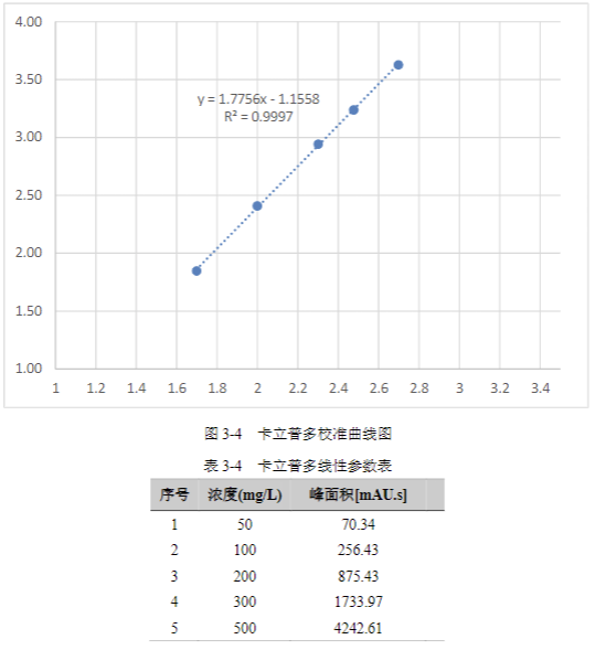卡立普多 线性方程为 y = 1.7756x - 1.1558 R2 = 0.9997。 因此, 卡立普多 在 50~500 mg/L浓