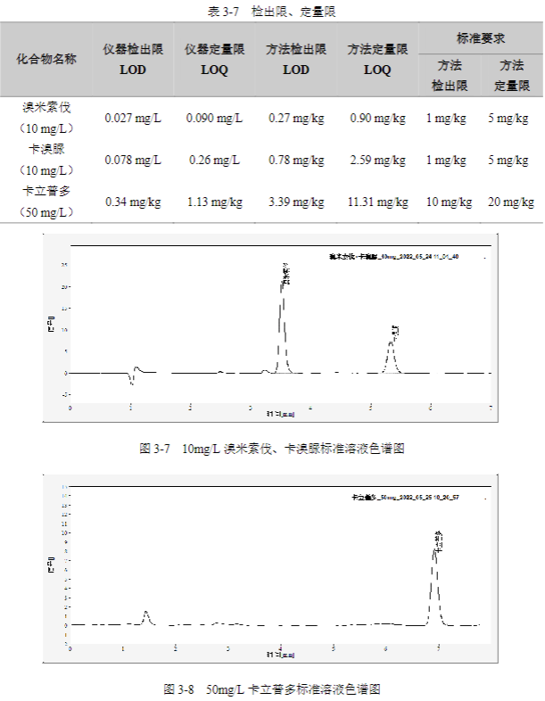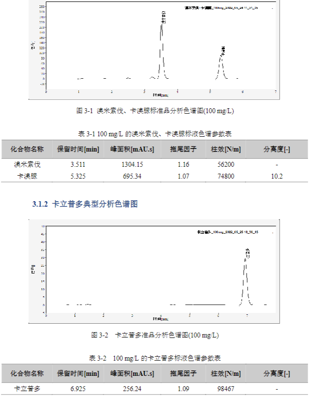 在溴米索伐、卡溴脲检测的色谱条件下,仪器的基线噪音为 0.0193 mAU(S/N=3),10 mg/L 溴米索伐、卡溴脲标准品溶液峰高为 21.356 mAU、7.456 mAU(图 3-7);在卡立普多检测的色谱条件下,仪器的基线噪音为 0.0185 mAU(S/N=3),50 mg/L 卡立普多标准品溶液峰高为 8.181 mAU(图 3-8);