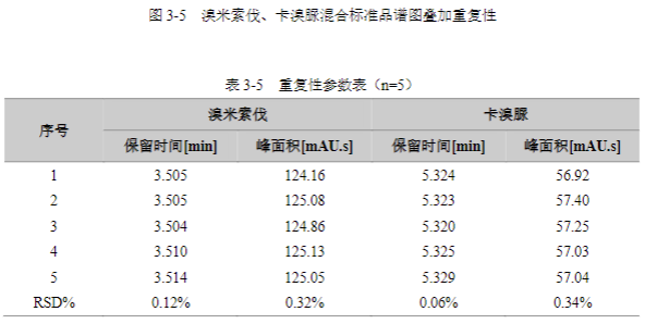 10 mg/L 溴米索伐、卡溴脲混合 标准溶液,连续进样 5针,峰面积和保留时间