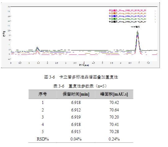浓度为50 mg/L卡立普多 标准溶液,连续进样 5针,峰面积和保留时间 RSD结果如下:
