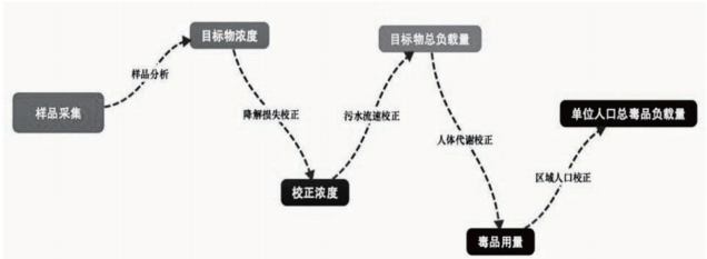 基于污水流行病学的现代禁毒情报工作,其实质就是通过标准化的样品采集与样品分析方法,对特定区域内污水中的毒品及其代谢物的浓度进行检测,通过引入降解损失校正、污水流速校正、人体代谢校正以及人口数量校正等方法,反算该地区某种(类)毒品的量,分析流程下图所示。