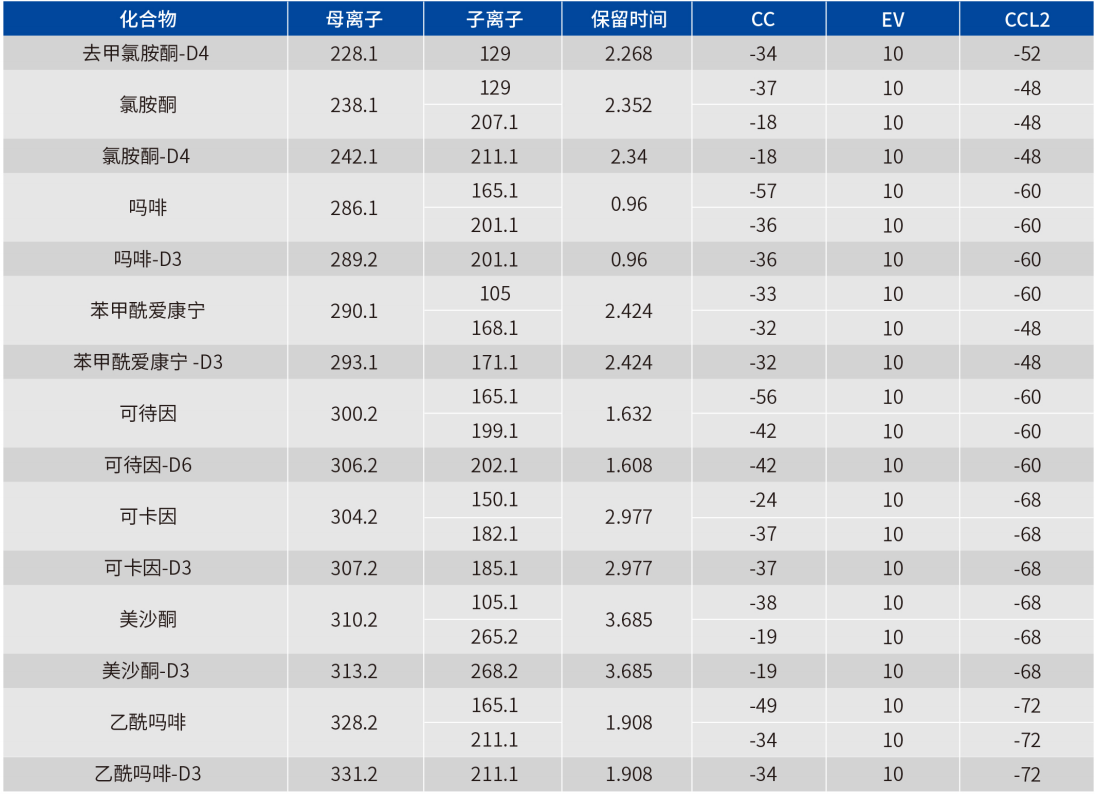 以下参数以 EClassical 3200L-MS2 Vertical 9100 三重四极杆液质联用仪为例,目标化合物质谱参数见表 2。